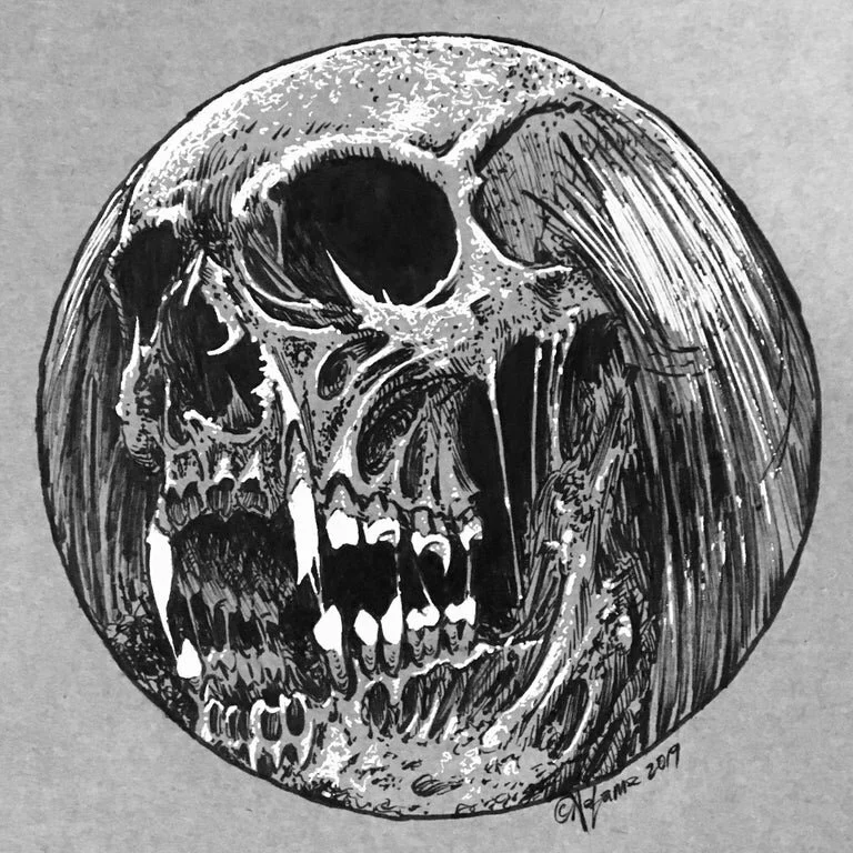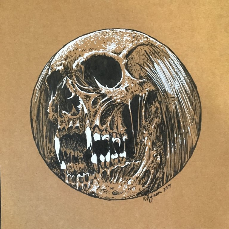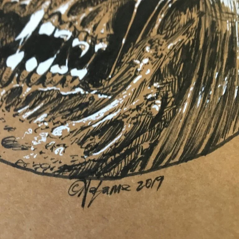 The Sawblade series by Defame was started in 2018. The series depicts elaborate illustrations on thin craft paper sheets, the sheets were used as protective space between sawblades when packaged. Illustration comes on matte backing sealed in clear crystal sleeve.