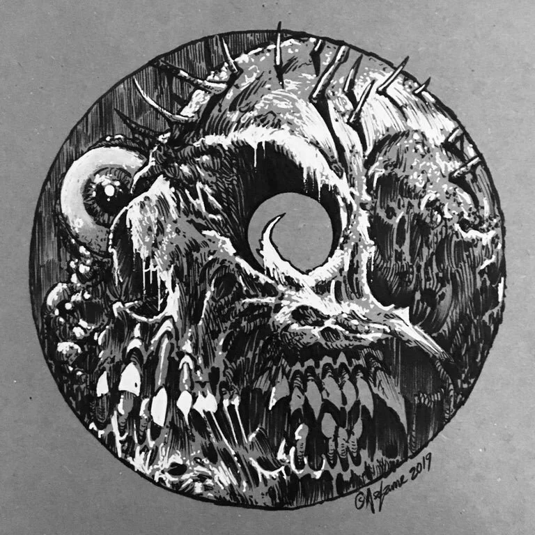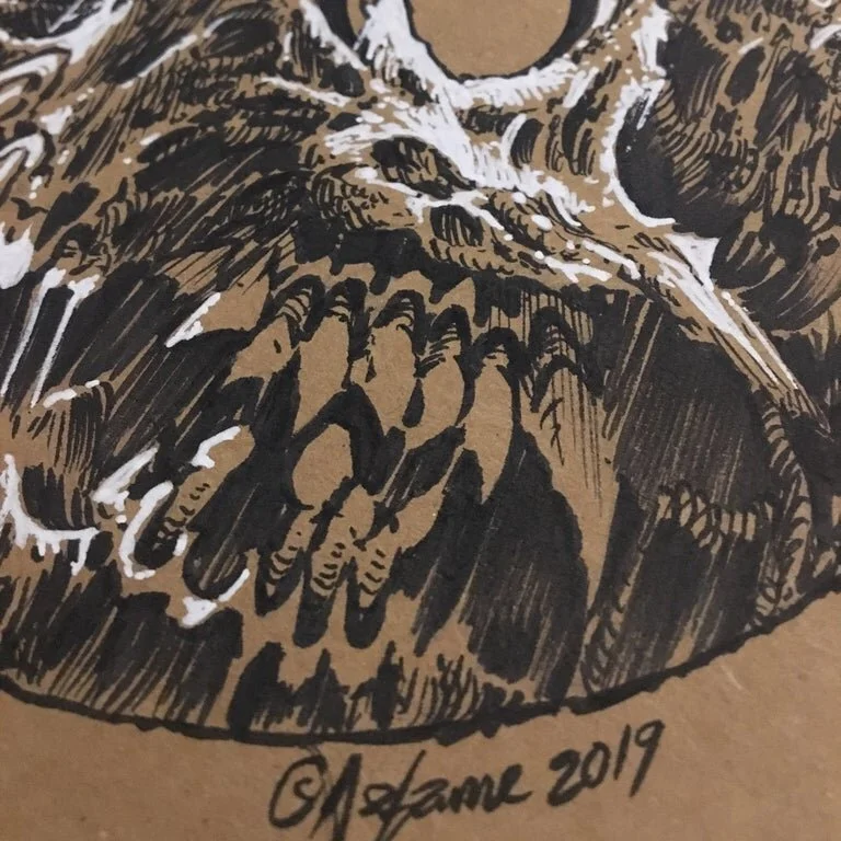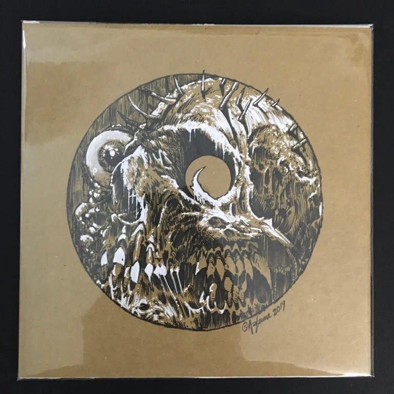 The Sawblade series by Defame was started in 2018. The series depicts elaborate illustrations on thin craft paper sheets, the sheets were used as protective space between sawblades when packaged. Illustration comes on matte backing sealed in clear crystal sleeve.